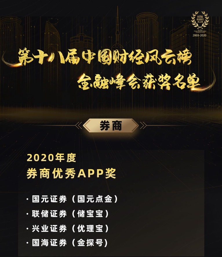 2021年1月15日,由和讯网主办的第十八届财经风云榜金融峰会奖项评选结果出炉,联储证券有限责任公司(简称“联储证券”)储宝宝APP荣获“2020券商优秀APP奖”。