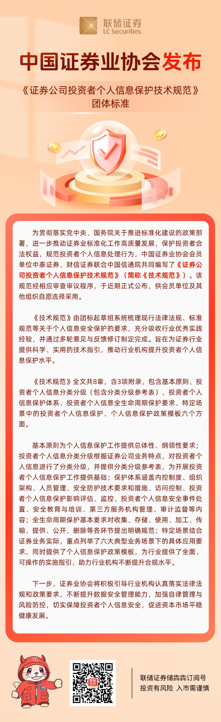 中国证券业协会发布《证券公司投资者个人信息保护技术规范》团体标准
