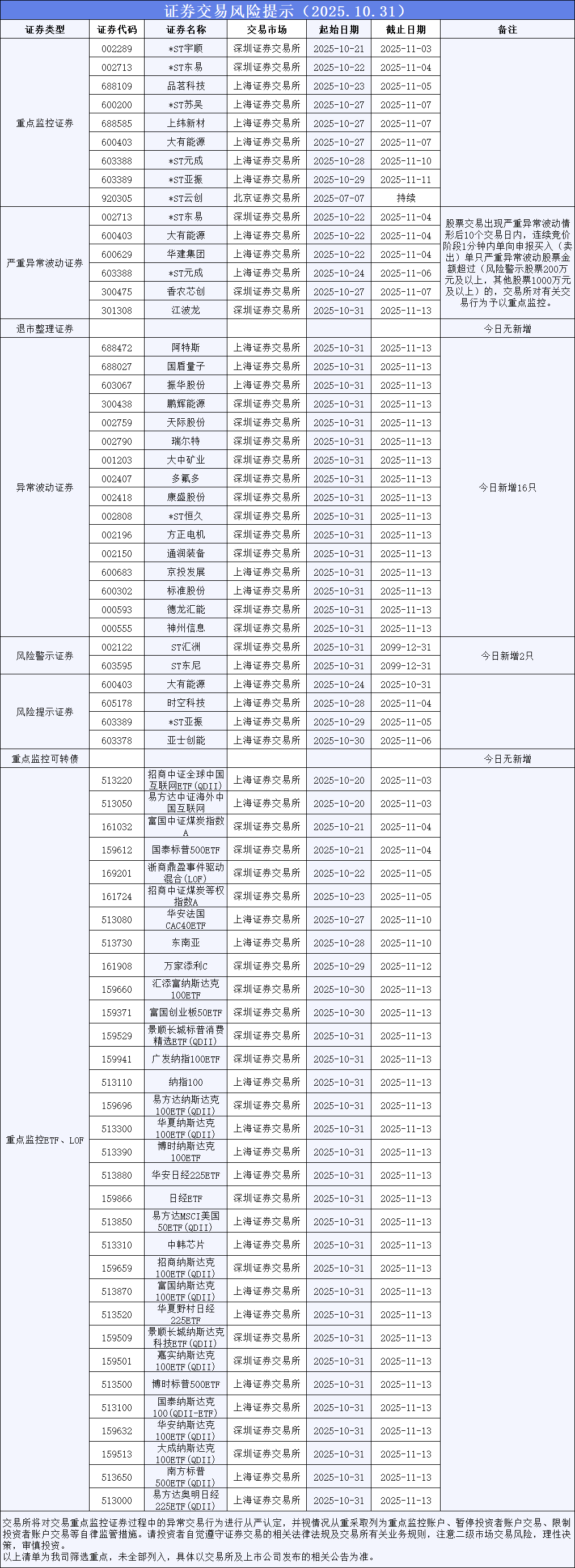 证券交易风险提示(2025年10月31日)