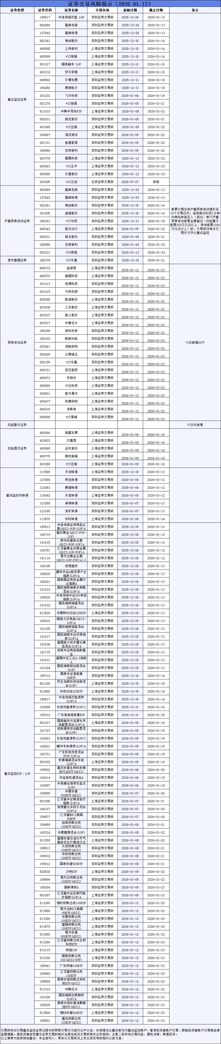 证券交易风险提示(2026年1月12日)