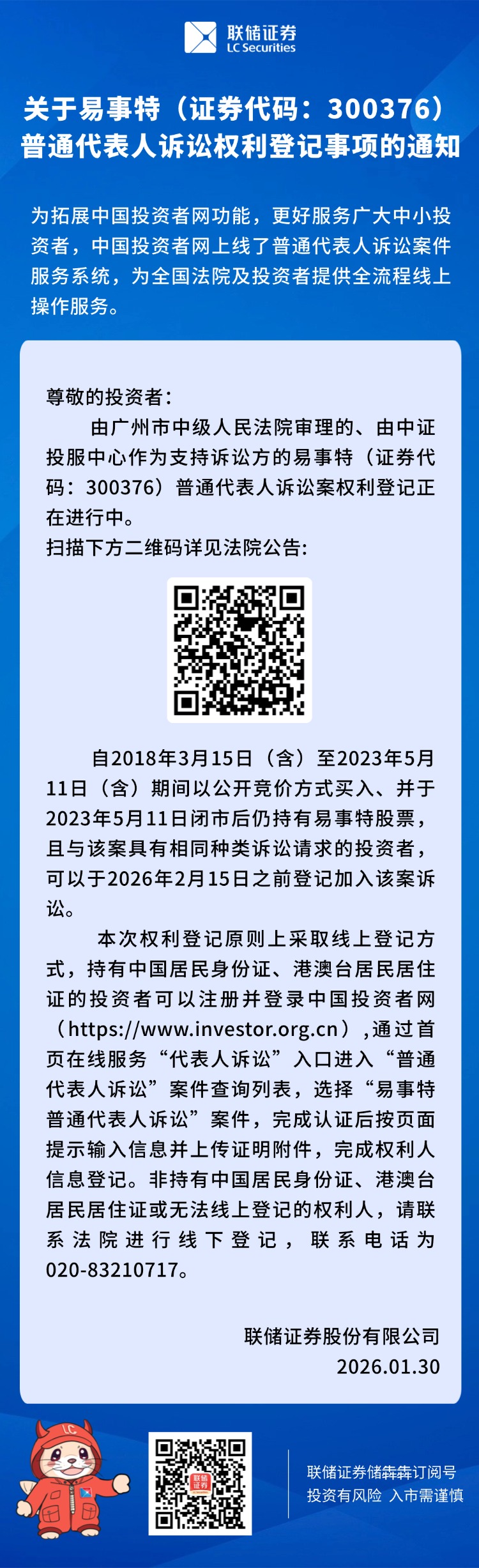 关于易事特(证券代码:300376)普通代表人诉讼权利登记事项的通知