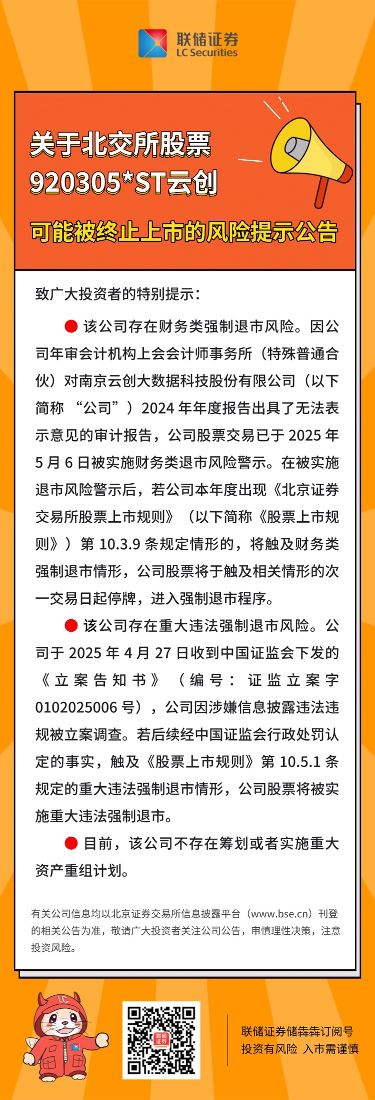 关于北交所股票920305ST云创可能能被终止上市的风险提示公告